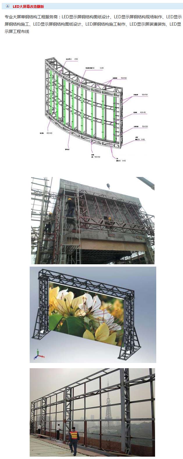 戶外廣告牌、樓頂廣告牌、精神堡壘、地產(chǎn)圍擋、亞克力吸塑燈箱、大型雕刻、地產(chǎn)圍墻廣告、LED單色及全彩顯示屏工程、夜景工程、大型標(biāo)牌、室內(nèi)外高清噴繪寫真等。